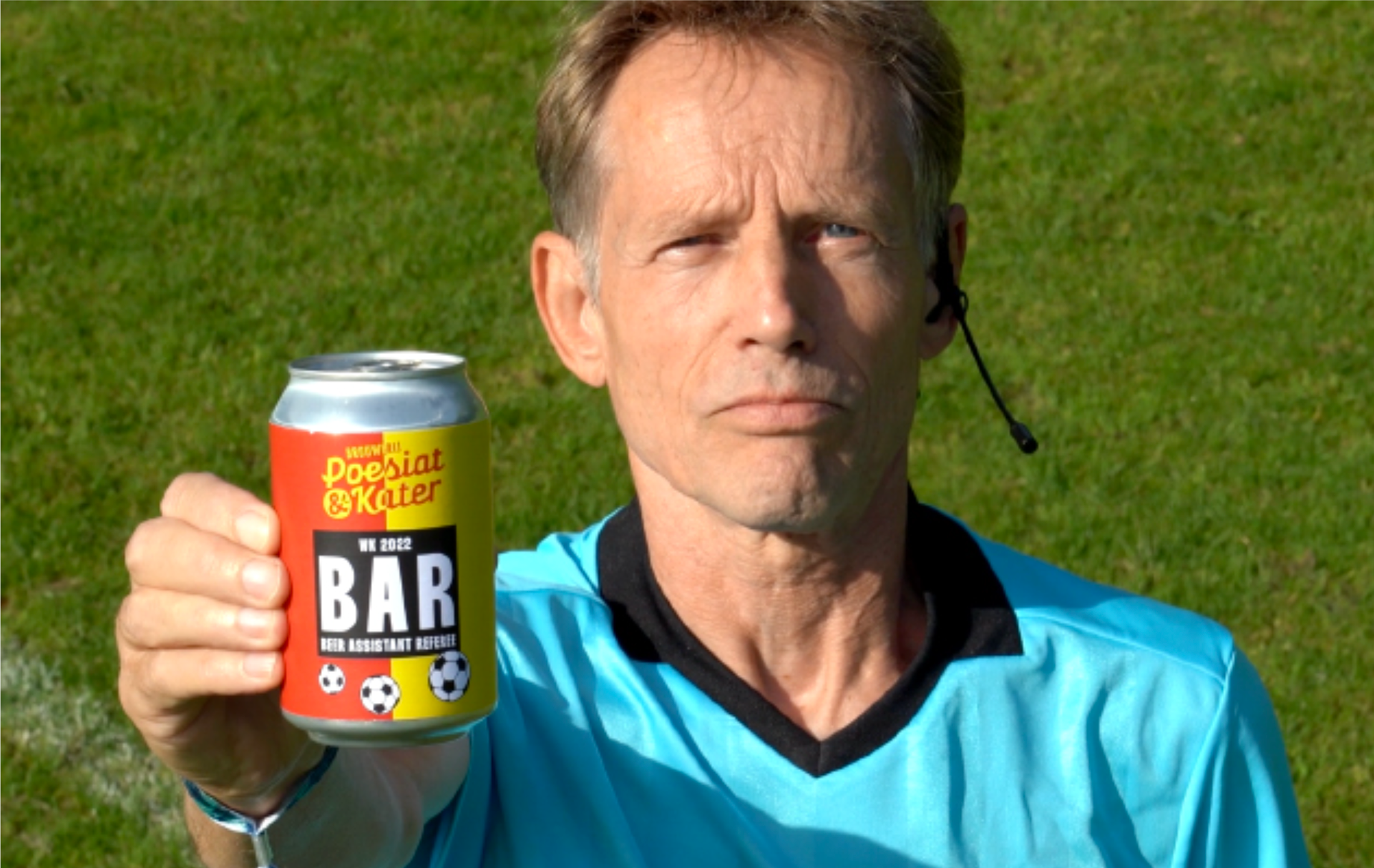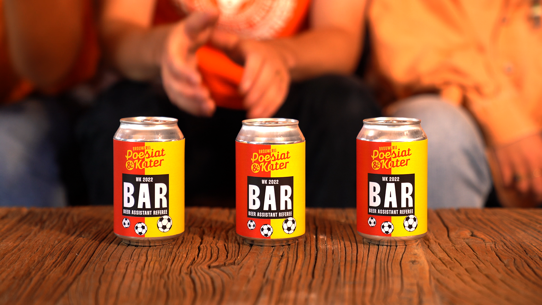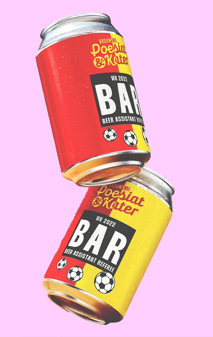 Creation: We developed a new beer can for Poesiat & Kater: the BAR-beer. (Beer-Assistant-Refferee) One side is red, the other side is yellow, with the can people can show their colour regarding this controversial World Cup, which in either option, is negative.