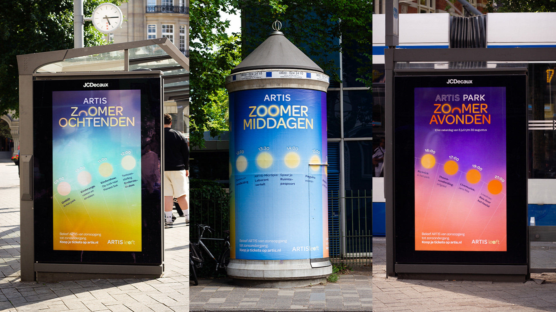 From dusk till dawn, experience summer in ARTIS! We developed a concept that connects three different, separate, visual executions and makes them one. You see the programming throughout the day, because from breakfast till live music during sunset, there’s always something happening at ARTIS.
